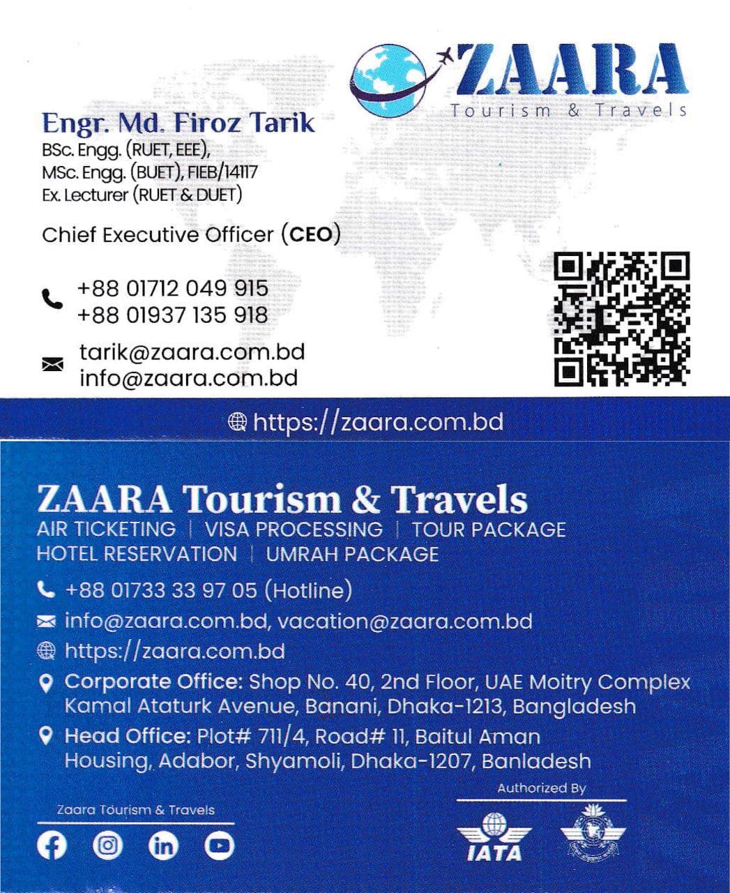 Eng. Md. Firoz Tarik is the Chief Executive Officer of Zaara Tourism & Travels, providing visionary leadership and strategic direction that drive the company’s growth and reputation in the travel industry. With a strong engineering background and a deep understanding of market dynamics, he oversees all operational, sales, and marketing functions to ensure excellence at every level. Under his guidance, Zaara Tourism & Travels has expanded its service portfolio, strengthened client relationships, and embraced innovative technologies to enhance customer experiences. His commitment to quality, integrity, and sustainable business practices continues to position the company as a trusted name for exceptional travel solutions.